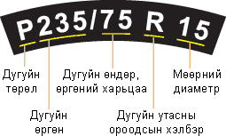 - Дугуйн төрөл: P - үсгээр суудлын автомашины дугуйг, LT - үсгээр бага оврын ачааны автомашины дугуйг, Т - үсгээр запас дугуйг гэх мэтчилэн тэмдэглэнэ.